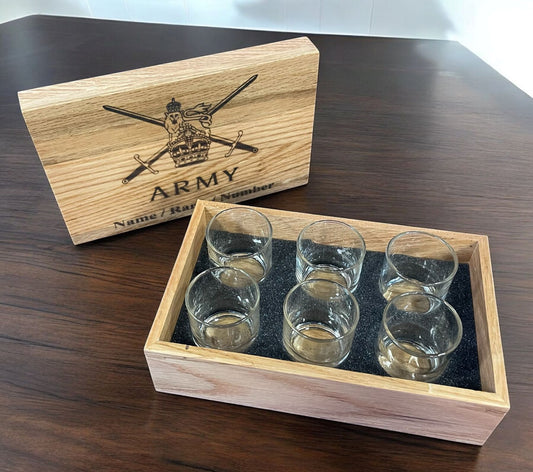 Shot Glass Collection in engraved Oak box.