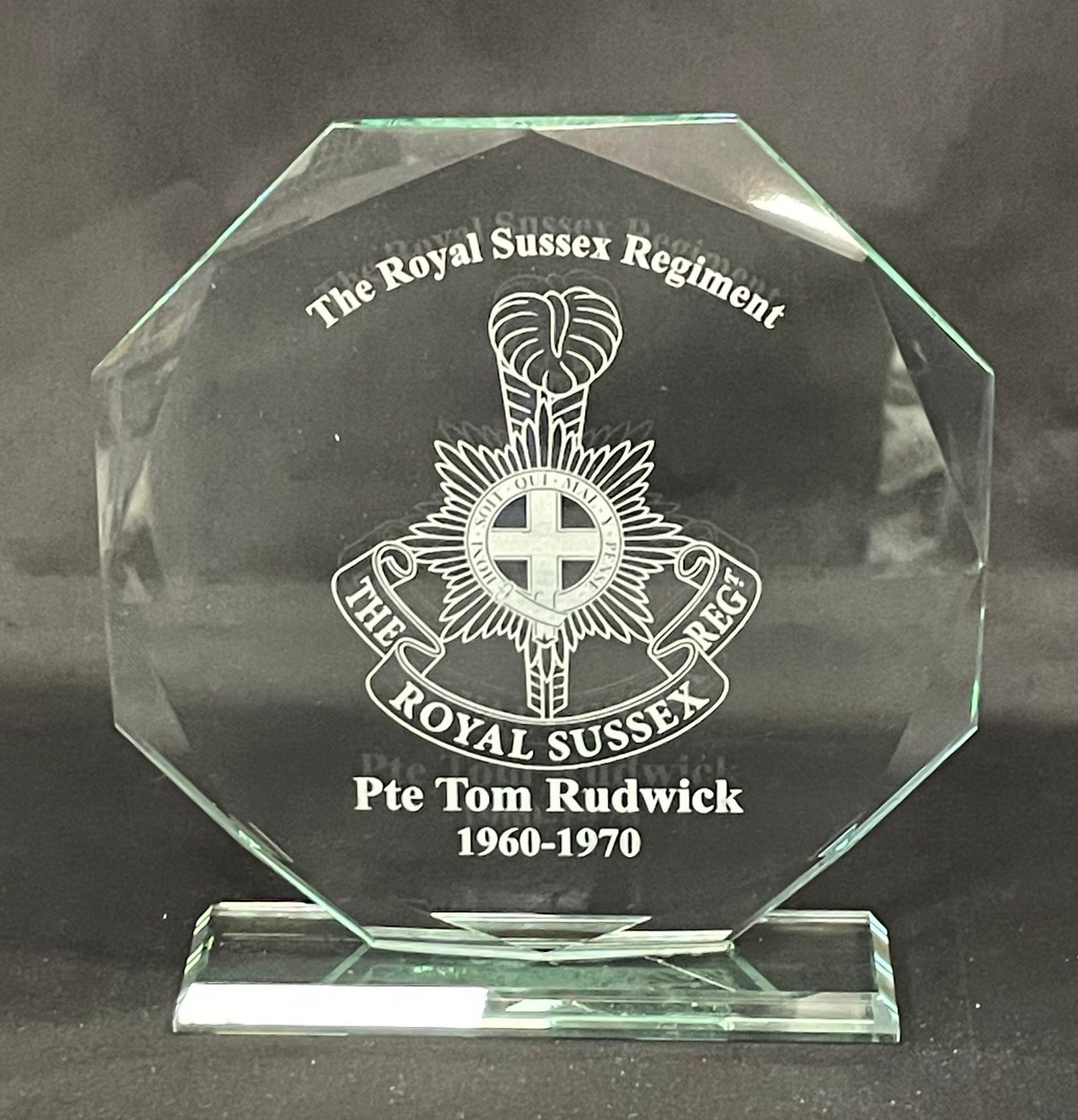 Something different for that leaving gift or as a presentation for coursework/passing out. A simple but classy glass desk plaque, which can be engraved with a huge variety of British Military badges from the British Army, The Royal Navy, Submarine Service, RAF and Royal Air Force Regiment.