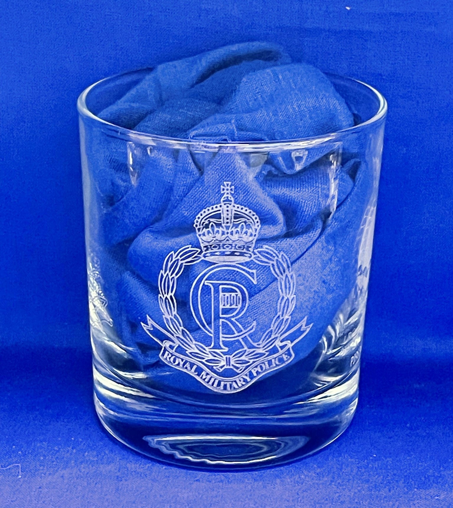 The Royal Military Police twin whisky glass set in silk-lined presentation box, with the choice to add a name or short message/inscription.